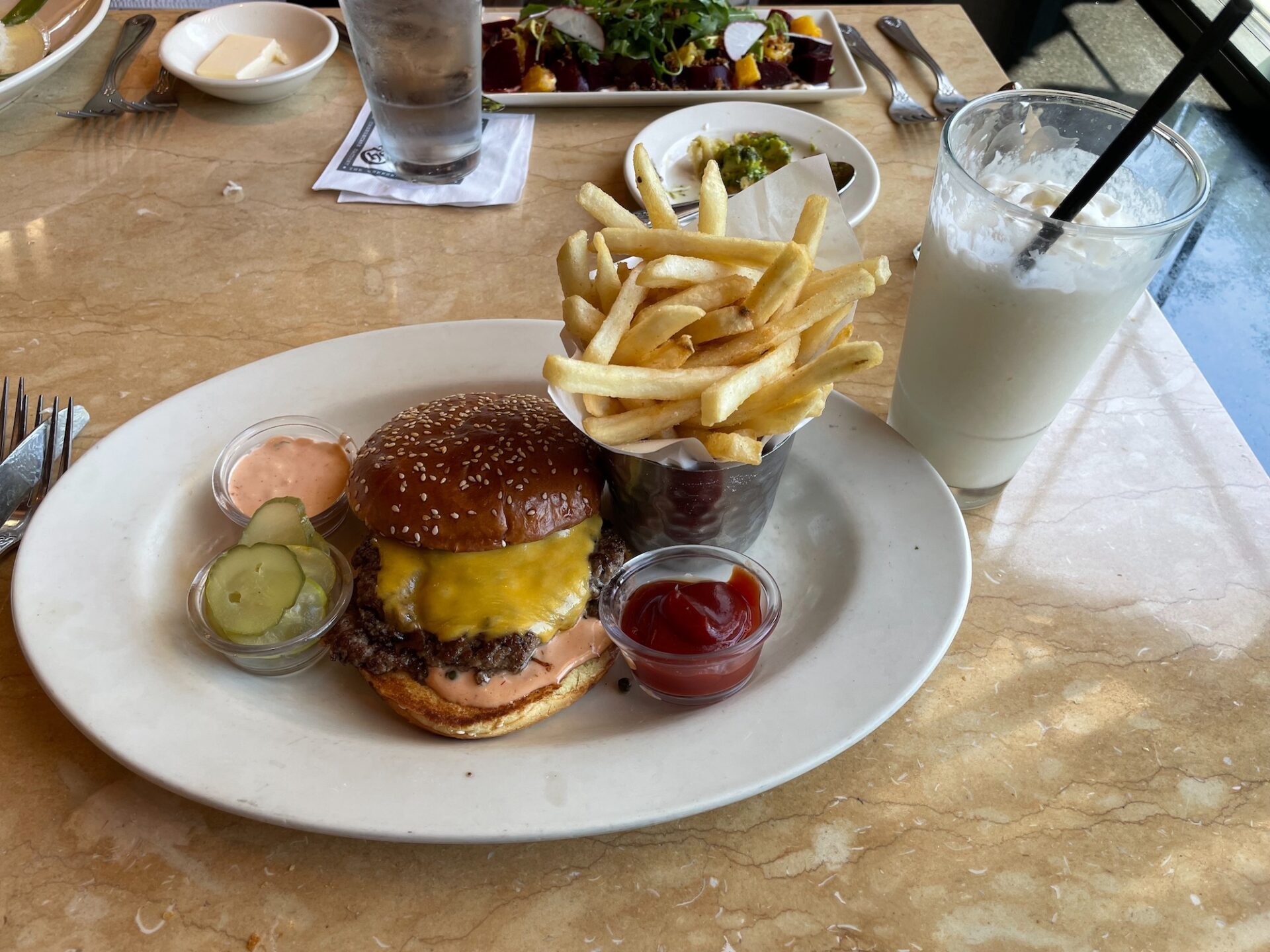 When we’re back at the car Brittany comes up with the great idea to have lunch at the Cheesecake Factory. I don’t think I’ve been there before, I mainly know it from one of my favorite tv-shows, The Big Bang Theory. The food choices are really wide, from Spaghetti to Burgers to Mexican food. I choose a classic combo: cheeseburger with fries and a milkshake. After the hike the food tastes great and even though I’m quite full I decide to also get dessert. You can’t go to the Cheesecake Factory without having cheesecake right? I get the ultimate red velvet one and it’s super delicious. Sitting in the restaurant enjoying all the food, I think to myself that life is pretty good.